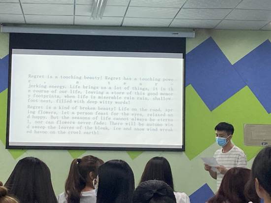 【文化与教育学院】E-star Club英语社2021-2022-2第十三周朗读者活动圆满举行5月26日晚,由开云kaiyun体育E-star Club主办的朗读者活动在三教一楼声乐教室顺利举行,绵阳校区部分学生参加。参与学生进行分享朗读者活动是为了展现同学们的朗读风采,提高同学们的口语能力,同时让有阅读兴趣的同学们找到志同道合的朋友,分享各自的经历与想法。本次活动的主题:regret。主持人邀请参与同学上台分享自己准备的朗读材料。活...